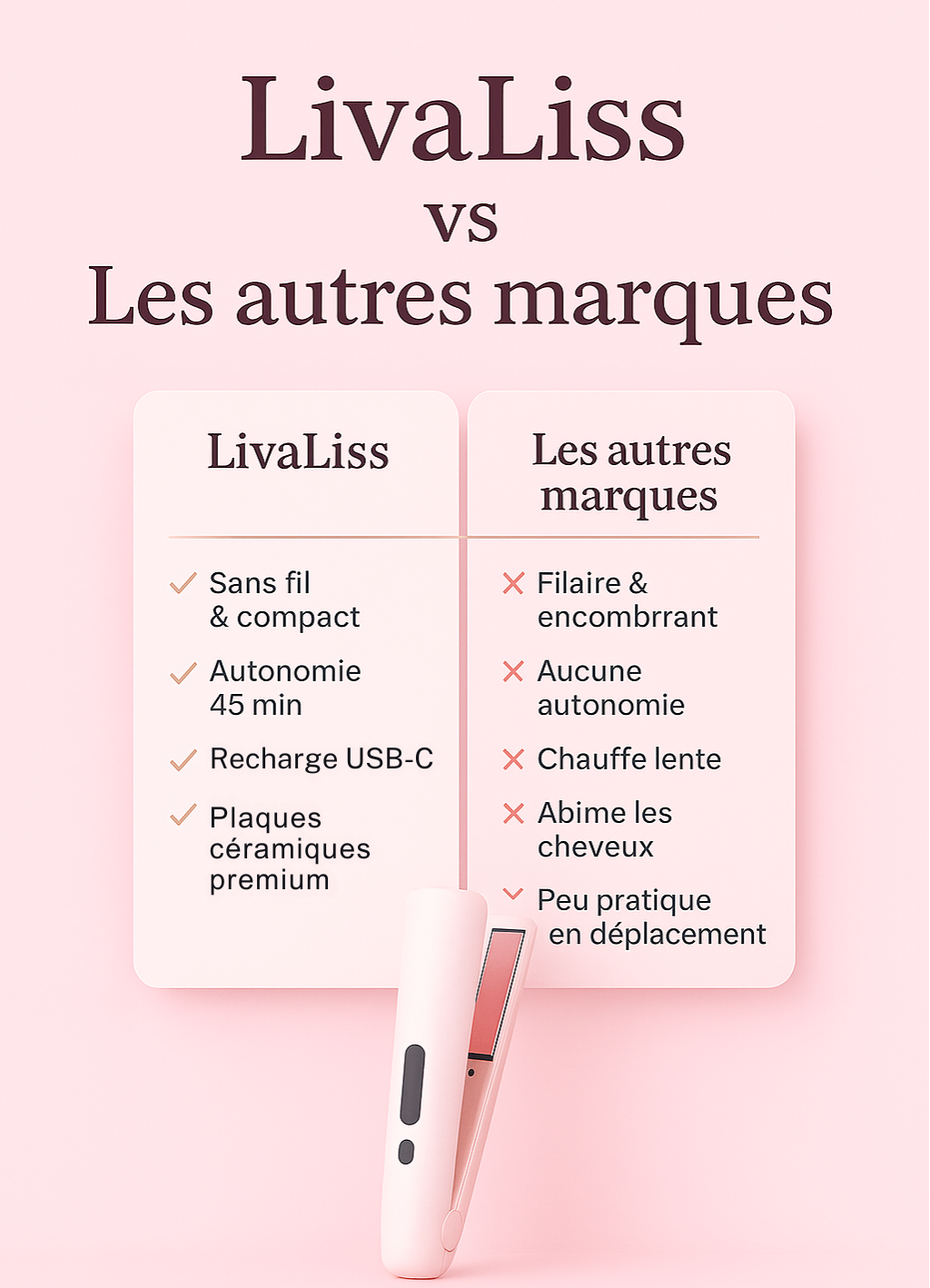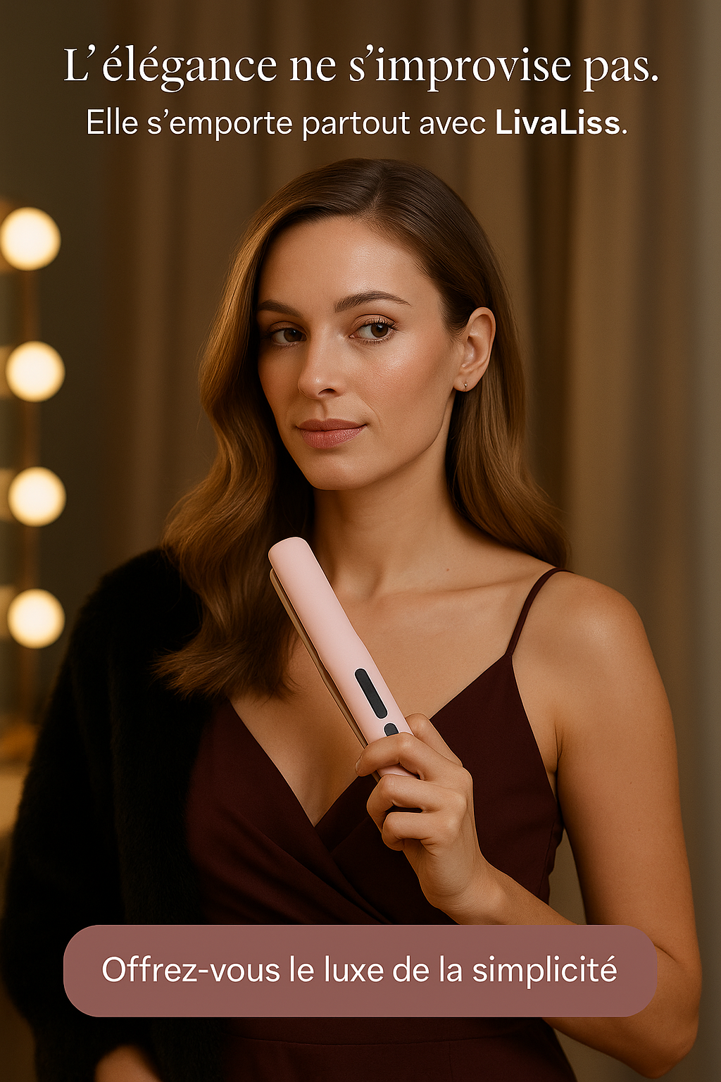 Découvrez LivaLiss, le lisseur sans fil nouvelle génération conçu pour celles qui refusent de choisir entre élégance, rapidité et liberté.Grâce à sa technologie céramique ionique et son design compact, obtenez un lissage professionnel en quelques minutes, où que vous soyez sans abîmer vos cheveux.