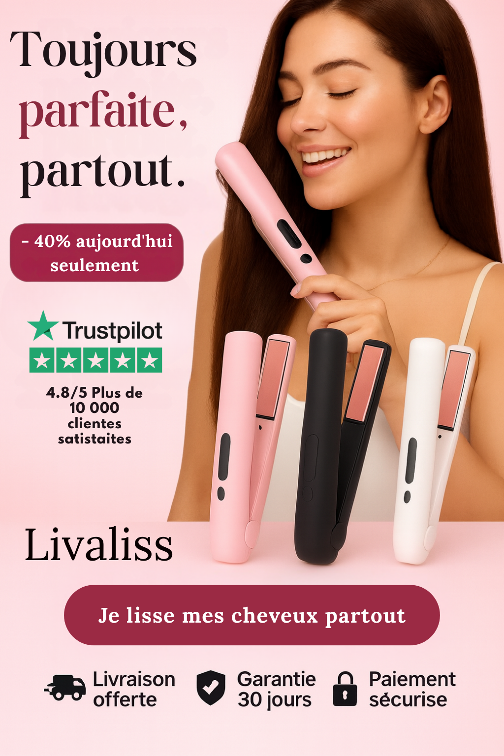 Découvrez LivaLiss, le lisseur sans fil nouvelle génération conçu pour celles qui refusent de choisir entre élégance, rapidité et liberté.Grâce à sa technologie céramique ionique et son design compact, obtenez un lissage professionnel en quelques minutes, où que vous soyez sans abîmer vos cheveux.