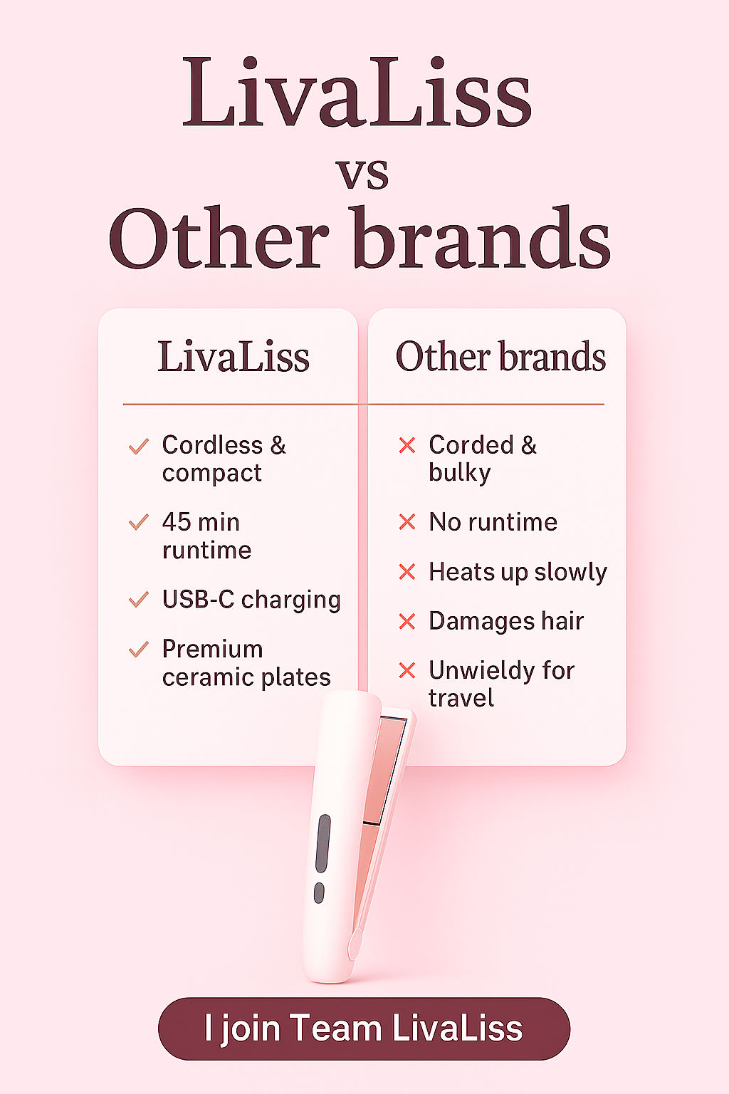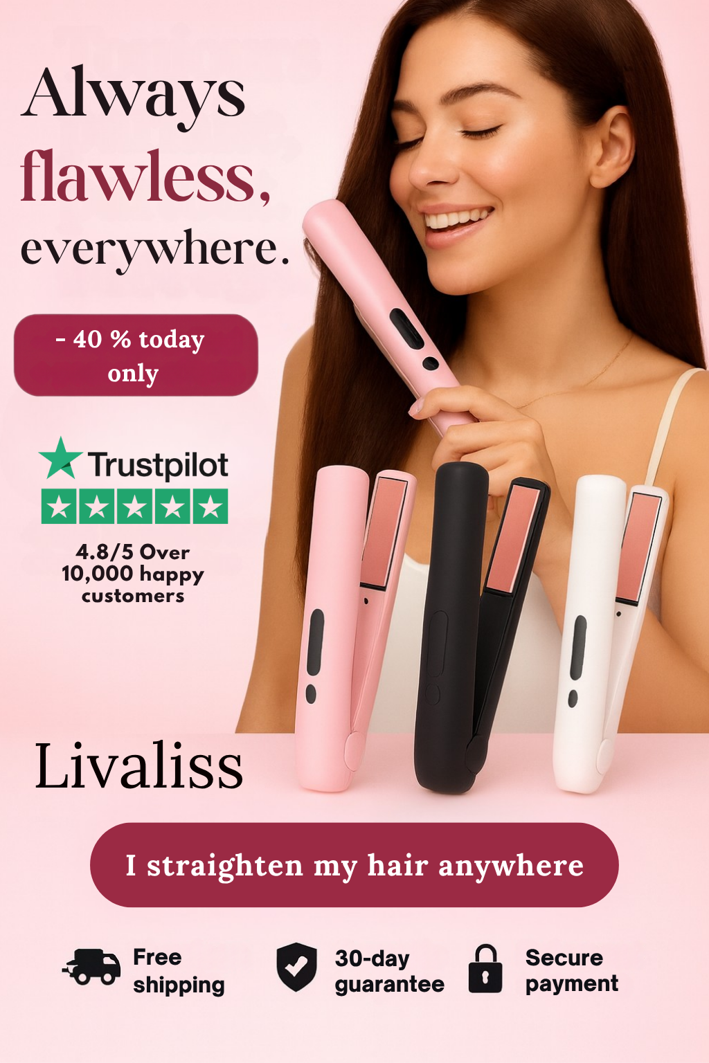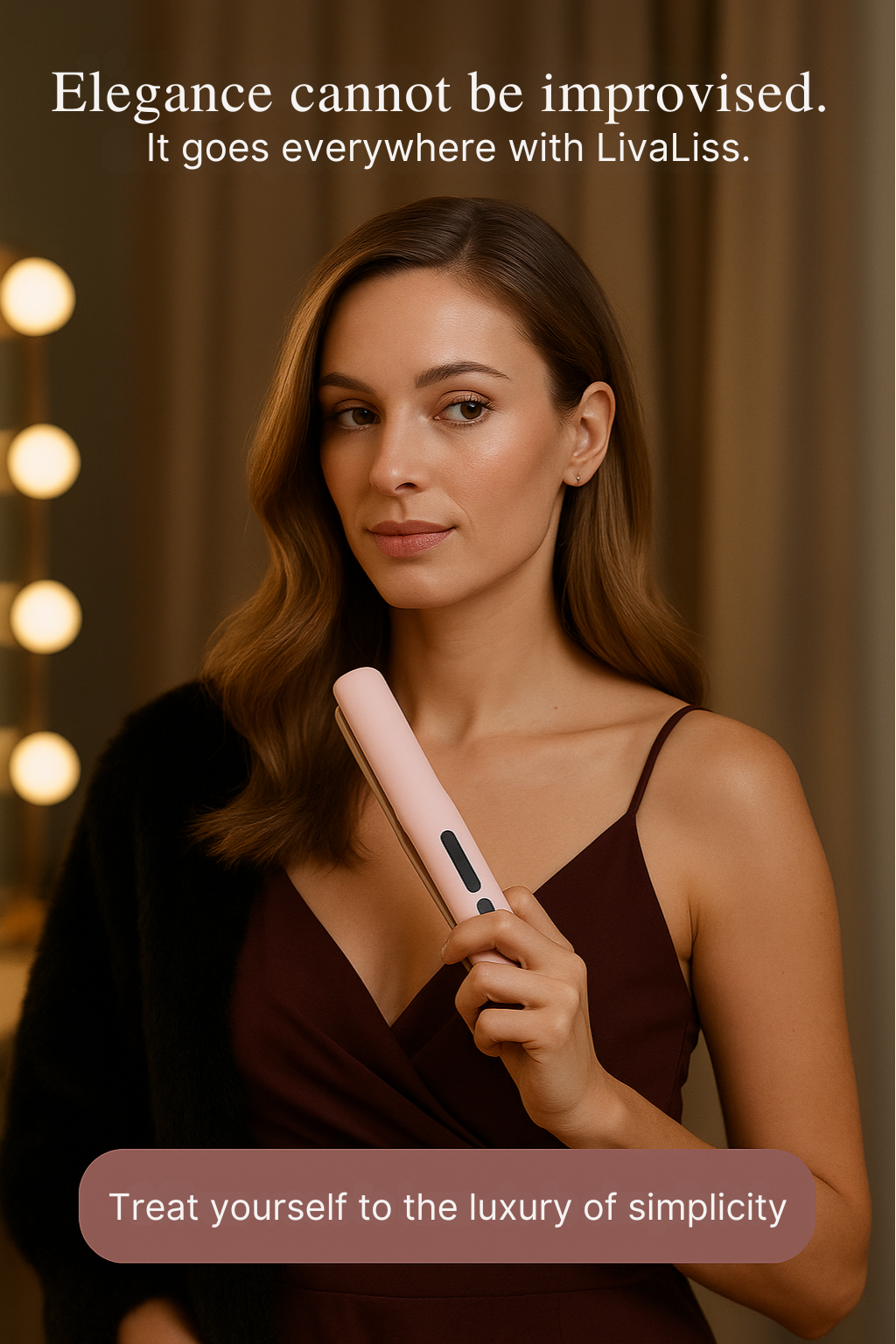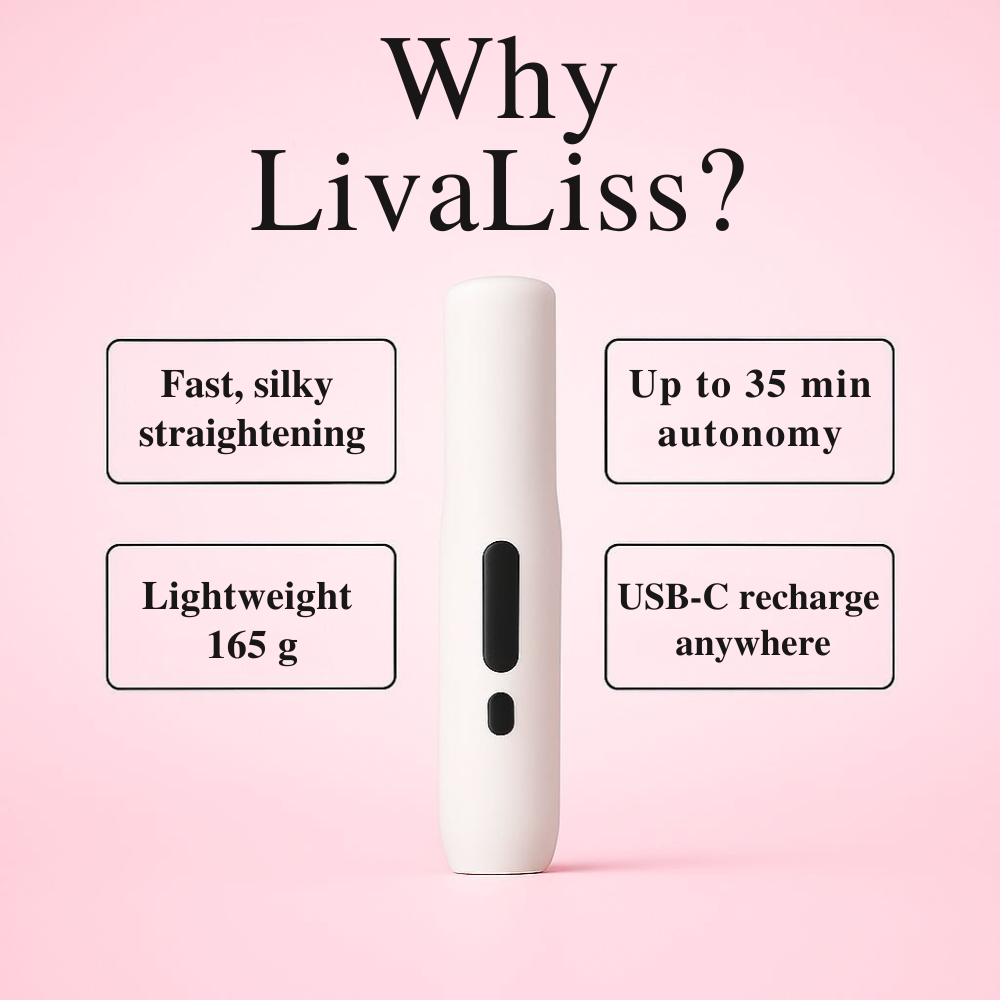 Discover LivaLiss , the new generation cordless hair straightener designed for those who refuse to choose between elegance, speed and freedom. Thanks to its ionic ceramic technology and compact design, achieve professional straightening in minutes , wherever you are, without damaging your hair.